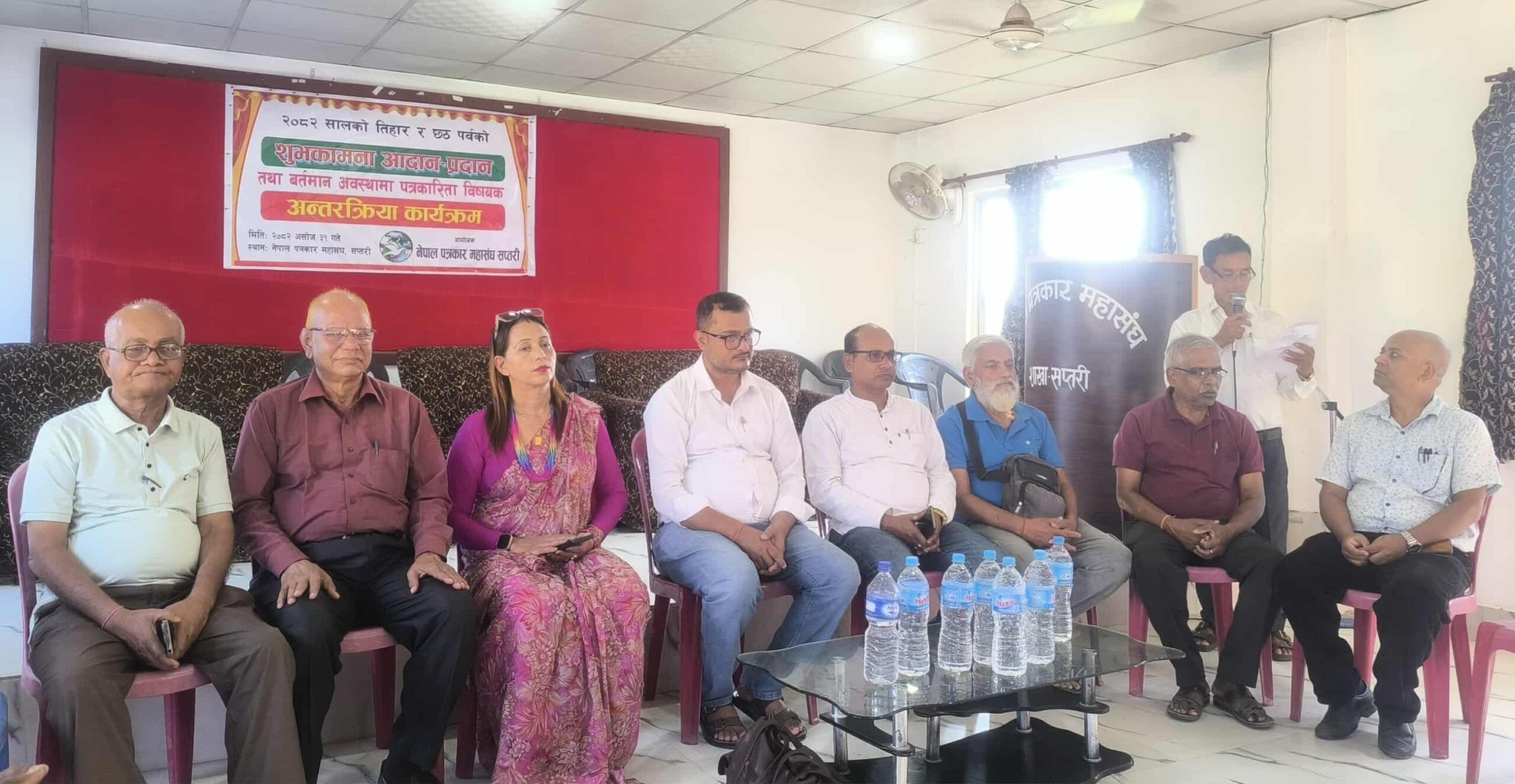 नेपाल पत्रकार महासंघ शाखा सप्तरीले तिहार र छठ पर्वको अवसरमा आयोजना गरेको शुभकामना आदान–प्रदान तथा ‘वर्तमान अवस्थामा पत्रकारिता’ विषयक अन्तरक्रिया कार्यक्रममा अग्रज सञ्चारकर्मीहरूले मर्यादित र जिम्मेवार पत्रकारितामार्फत पेशाको इज्जत कायम राख्नुपर्ने सुझाव दिएका छन् ।