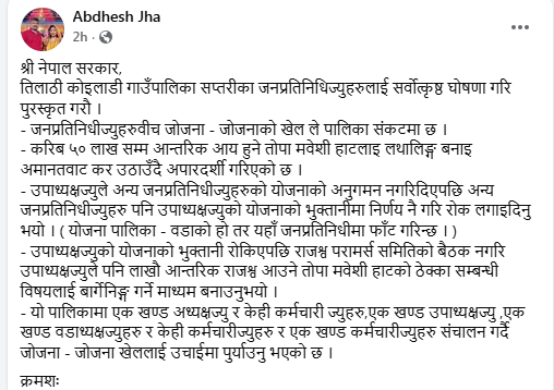 उनको पोस्टमा पालिकाभित्र अध्यक्ष पक्ष, उपाध्यक्ष पक्ष, केही वडाध्यक्ष तथा कर्मचारीहरू अलग–अलग समूहमा विभाजित भई योजना–योजनाको खेललाई चरम सीमामा पुर्‍याएको उल्लेख छ । यसले समग्र पालिकाको विकास र सुशासनमा गम्भीर असर परिरहेको भन्दै उनले सरोकारवालाहरूको ध्यानाकर्षण गराएका छन् ।