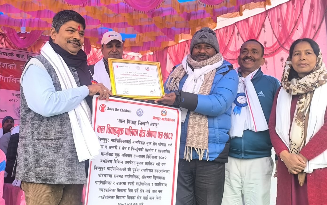 • राजविराज । सप्तरीको बिष्णुपुर गाउँपालिकालाई मधेश प्रदेश तथा जिल्लाकै चौथो बालविवाह मुक्त गाउँपालिका घोषणा गरिएको छ ।