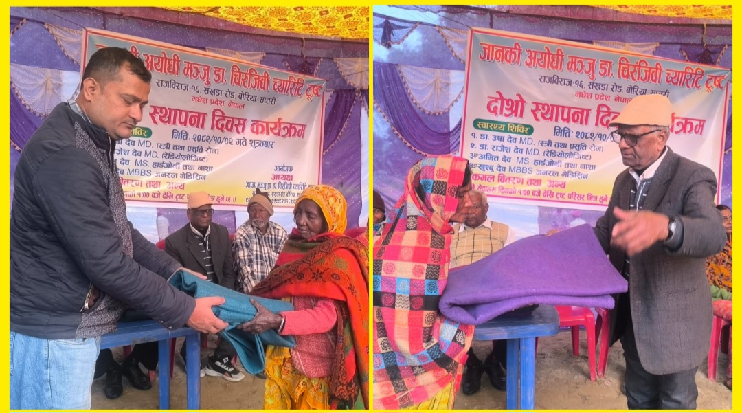शुक्रबार राजविराज नगरपालिका–१६ बोरिया स्थित नवनिर्मित ट्रस्ट प्राङ्गणमा आयोजित कार्यक्रममा मबिव क्याम्पसका अवकाशप्राप्त पूर्व क्याम्पस प्रमुख तथा ट्रस्टका अध्यक्ष प्रा.डा. चिरञ्जीवी लाल देवले २५ जना जेष्ठ नागरिकलाई कम्बल वितरण गरेका थिए । सोही अवसरमा निःशुल्क स्वास्थ्य शिविर पनि सञ्चालन गरिएको थियो ।