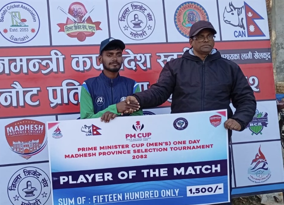 उत्कृष्ट प्रदर्शनका लागि महोत्तरीका रमेश सहनी खेलको ‘प्लेयर अफ द म्याच’ घोषित भए। उनलाई सप्तरी क्रिकेट संघका सदस्य बिरेन्द्र कुमार यादवले नगद १ हजार ५ सय रुपैयाँसहित ट्रफी प्रदान गरे ।